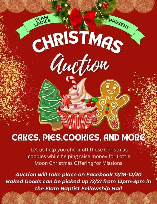 An album will go live at 7:00 pm on Thursday, December 18th, with all the items available. To bid, comment on the picture with your amount. All bids must increase by a minimum of $1. The last bid in at 9:00 pm on December 20th will win that item. All items must be picked up between 12:00-2:00 pm at Elam Baptist church (unless other arrangements are made in advance).